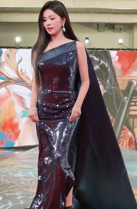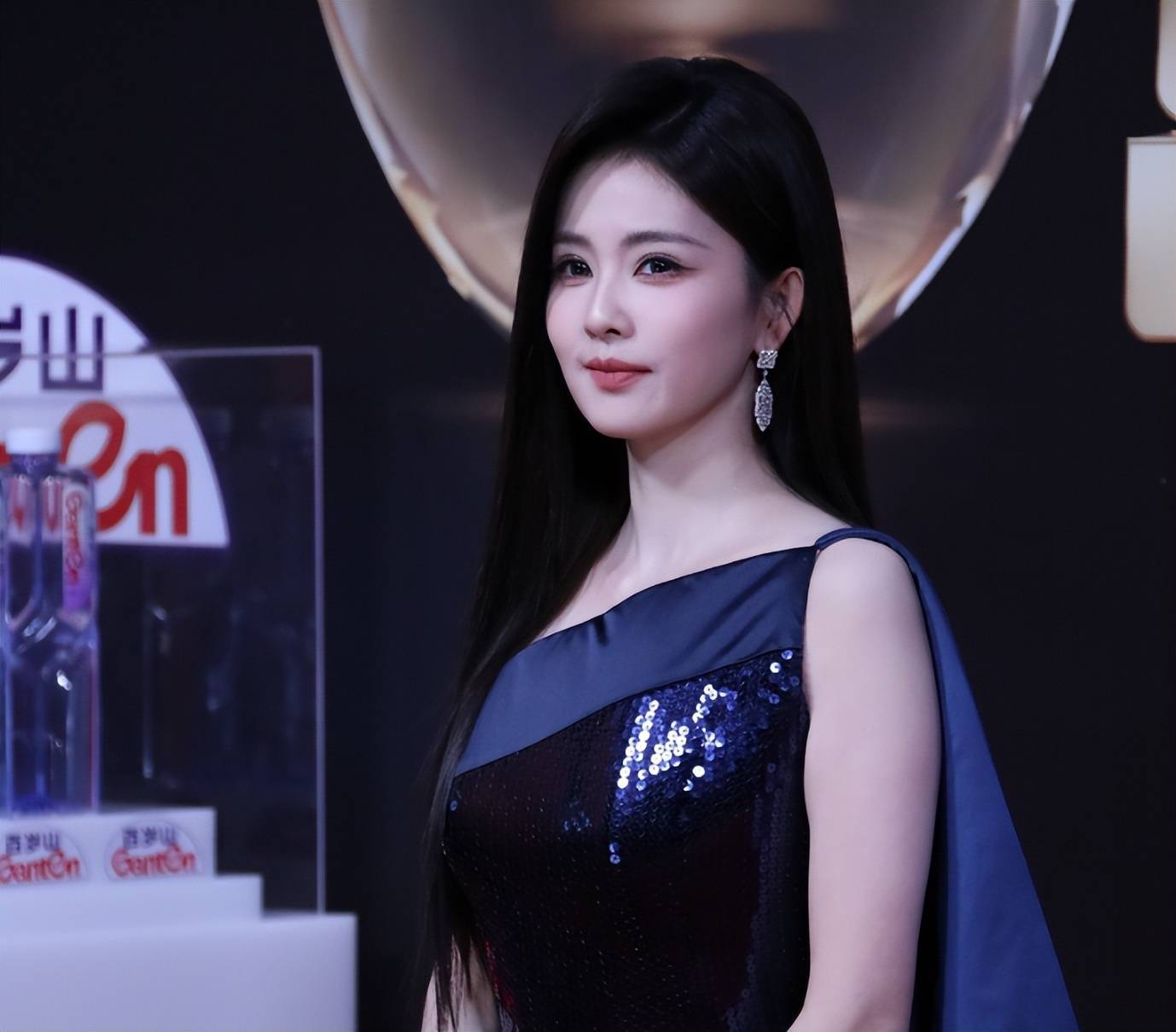 这套高定蓝色斜肩亮片裙其实是2024年的款式,设计都过时了,色调也显得人老气横秋的。